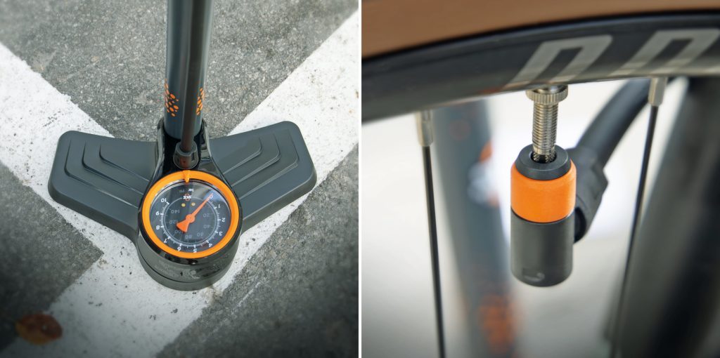 La pompe Airkompressor Clik Tec 10.0 de SKS reprend le design classique des pompes à pied du fabricant allemand avec une grande poignée ergonomique, un manomètre de précision analogique et un tube en acier. La pompe supporte une pression maximale de 10 bars (144 PSI).