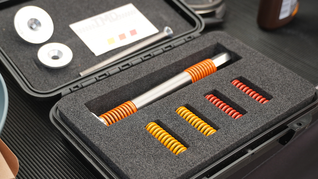 Le mass damper appliqué au vélo reste aujourd’hui un domaine en exploration. Quelques acteurs spécialisés travaillent sur des solutions dédiées au VTT. Des prototypes circulent également dans certains milieux compétitifs ou chez des préparateurs indépendants. Depuis 2024, on les aperçoit notamment de plus en plus souvent sur les VTT de DH des épreuves de World Cup.
