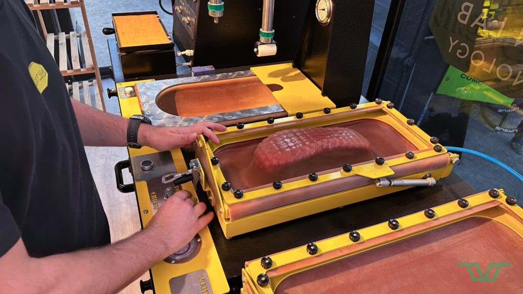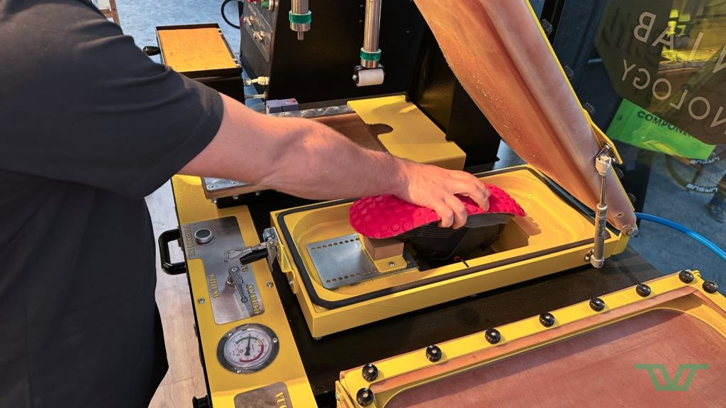 La chaussure est ensuite mise dans une pression sous vide qui va finir de coller parfaitement la semelle XS Ride sur la chaussure. Il faut ensuite laisser reposer la chaussure pendant au moins 12 heures.
