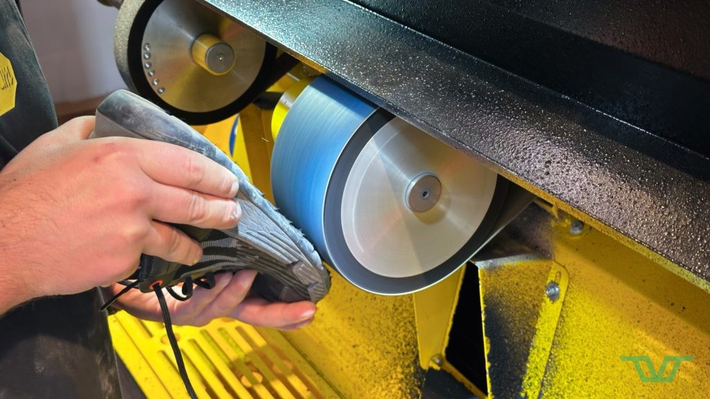 La première étape consiste à complètement poncer la semelle de la chaussure existante ainsi que de poncer légèrement la semelle de remplacement.