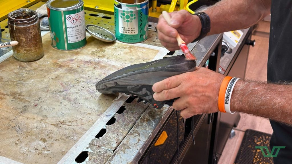 La deuxième étape consiste à appliquer un adhésif poligrip M350 sur la semelle de la chaussure et sur la semelle de remplacement. Les deux vont alors reposer pendant 30 minutes avant l’étape suivante.