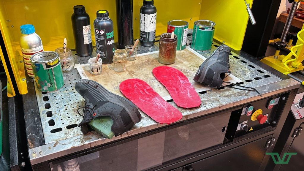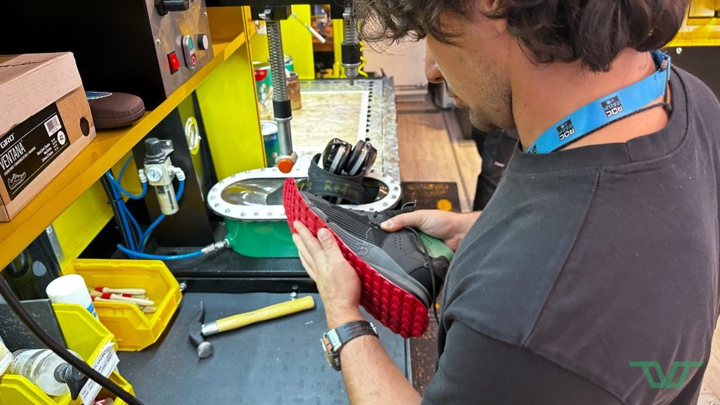 Nous avons profité du Roc d’Azur pour faire ressemeler nos chaussures FiveTen Crosstrail dont la semelle était finalement encore en bon état après trois années de pratique VTT, mais c’était l’occasion de tester la semelle XS Ride et de voir le processus de ressemelage. Vibram proposait pour l’évènement trois couleurs de semelle : noir, violet ou rouge.