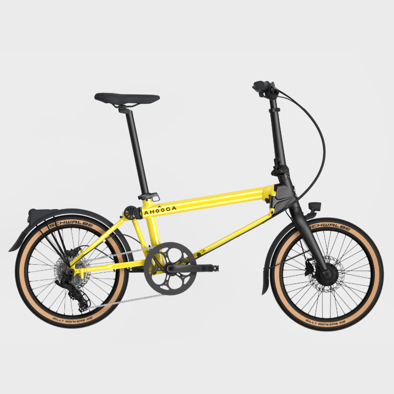 Le Ahooga E-Max est un vélo pliant électrique à roues de 20″, dont l’encombrement une fois plié se limite à 72 x 69 x 37 cm. Il est ici proposé avec une transmission à chaîne associée à un dérailleur Microshift 8 vitesses. Son moteur est installé sur la roue avant, développe jusqu’à 35 Nm de couple et est alimenté par une batterie de 248 Wh intégrée au tube supérieur. Des freins à disque hydrauliques Shimano MT200 et des pneus Schwalbe Billy Bonkers de 2″ complètent l’ensemble. Cette version est donnée pour 17,5 kg, convient aux cyclistes entre 1m40 et 2m pesant jusqu’à 120 kg.