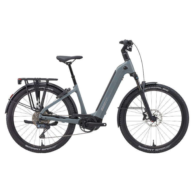 Le Giant AnyTour X E+ 1 est un VTC électrique extrêmement polyvalent, doté d’un puissant moteur central associé à une grosse batterie de 800 Wh, d’une fourche suspendue sur 100 mm, de pneus VTT Schwalbe Smart Sam, et d’une transmission Shimano Cues 11 vitesse électronique (Di2). Son freinage est confié à des freins hydrauliques Deore à 4 pistons. Il est livré avec une tige de selle télescopique, des capteurs de pression au niveau des valves des roues et tout le nécessaire pour être utilisé au quotidien (antivol de cadre, béquille, garde-boues, porte-bagages…). C’est un vélo qui n’a pas choisi entre la ville et l’aventure, et qui sera à son aise sur l’asphalte mais aussi (et surtout) sur des terrains très variés et fera office de petit VTT électrique à cadre ouvert.