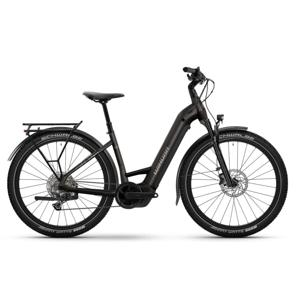 Décliné en cadre ouvert et fermé, le Winora Yucatan X12 Pro est un vélo électrique de trekking tout équipé (garde-boue, éclairage, porte-bagages et béquille). Il est propulsé par un moteur Bosch Performance Line PX pouvant délivrer 90 Nm (85 Nm par défaut) associé à une batterie amovible de 800 Wh lacée dans le tube diagonal. Le vélo dispose de pneus large Schwalbe Johnny Watts aussi à l’aise sur la route qu’en tout terrain ou sur les chemins. Côté transmission, on retrouve un dérailleur Shimano Deore 12 vitesses. Le freinage est assuré par des freins à disque hydrauliques Shimano Deore à quatre pistons. Enfin, il embarque de série une tige de selle télescopique qui va faciliter la montée et la descente du vélo et améliorer la maniabilité du vélo dans les parties techniques (pour ceux qui veulent en découdre).