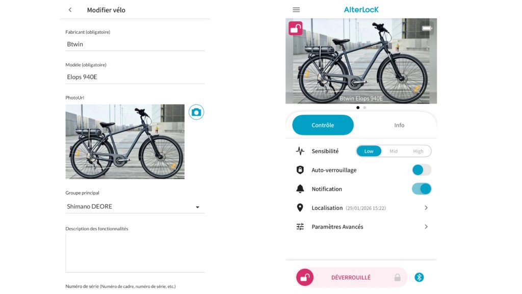Une fois l’application Alterlock téléchargée sur iOS ou Android, il faut se créer un compte puis renseigner les informations sur le vélo : fabricant et modèle du vélo, ainsi que des informations additionnelles comme le groupe principal (dérailleur et/ou pédalier), le numéro de série, le numéro d’enregistrement et une photo.