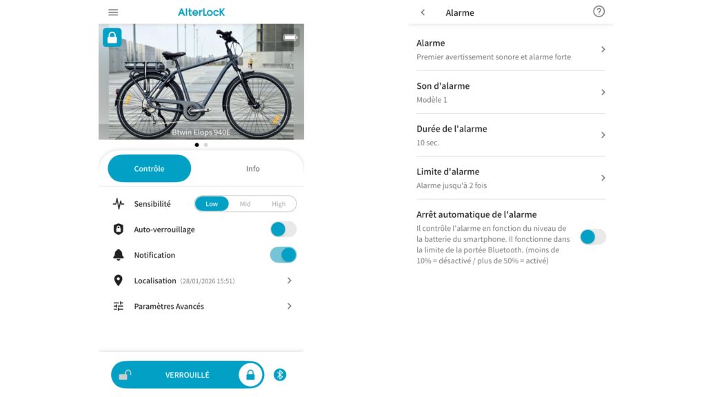 La fonction d’auto-verrouillage permet d’activer l’alarme lorsque le smartphone n’est plus à proximité et à l’inverse, de désactiver l’alarme lorsque l’on s’approche du vélo. L’alarme s’active effectivement lors de la perte de connexion Bluetooth avec le smartphone. En revanche, le déverrouillage ne se fait pas toujours automatiquement.