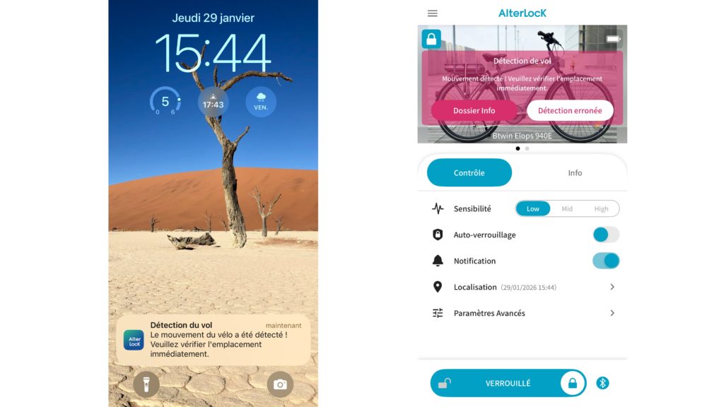 En fonction du niveau de sensibilité choisi, on reçoit une alerte dès que le vélo bouge. On peut alors choisir d’ignorer l’alerte en cliquant sur « Détection erronée ». L’alarme va alors s’arrêter de sonner, mais elle ne va pas se réinitialiser. Si elle a déjà été déclenchée plusieurs fois, elle ne sonnera plus. En revanche, on va continuer de recevoir des alertes à chaque fois que le vélo est déplacé.