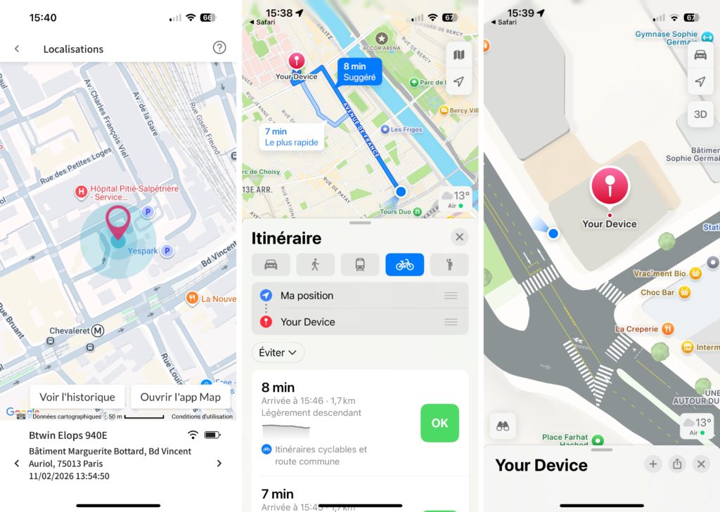 La couverture est excellente en extérieur et un peu moins en intérieur. Si le vélo est placé dans un parking en sous-sol ou dans une cave, la location s’avère plus compliquée. On aurait toujours le dernier point de suivi sur la carte, mais la localisation proche est plus compliquée qu’avec une balise Bluetooth de type AirTag ou SmartTag.