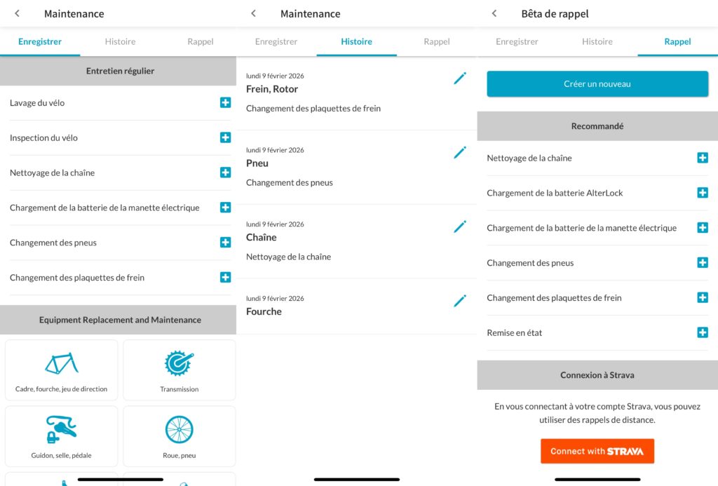 Cela peut paraitre une fonction anecdotique, mais l’intégration d’un carnet d’entretien est plutôt utile et permet de regrouper les informations sur son vélo. Il est possible de renseigner la date du dernier lavage, de la dernière inspection du vélo, du nettoyage de la chaine, du chargement de la batterie de la commande de dérailleur, du changement des pneus ou des plaquettes de freins.