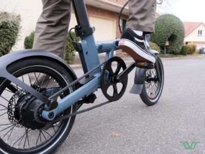 Nous connaissons ce moteur pour l’avoir déjà essayé lors de notre test du Voltaire Rivoli. Nous avions été plutôt convaincus par son fonctionnement et étonnés par sa puissance. Eh bien sachez que c’est encore mieux monté sur ce petit vélo pliant, qui bénéficie de par ses petites roues et son centre de gravité bas de toute la fougue de ce moteur électrique.