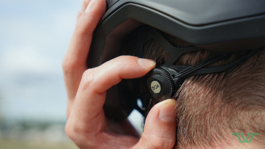 Le réglage BOA s’opère en tournant une molette à l’arrière du casque qui vient serrer un fil très fin qui passe de chaque côté de la tête. Une fois correctement serré, le casque reste parfaitement en place, sans sensation d’être trop serré, même après des sorties de plusieurs heures.