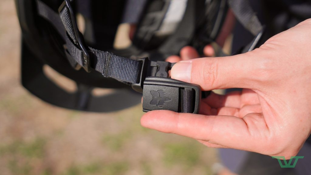 La sangle jugulaire se règle facilement et la fermeture par une boucle magnétique Fidlock est un bonheur à l’usage. Ce type de boucle s’attache et se détache d’une main, même en portant des gants. Aucune mousse ne vient adoucir le contact avec la gorge, mais cela reste confortable dans l’ensemble.
