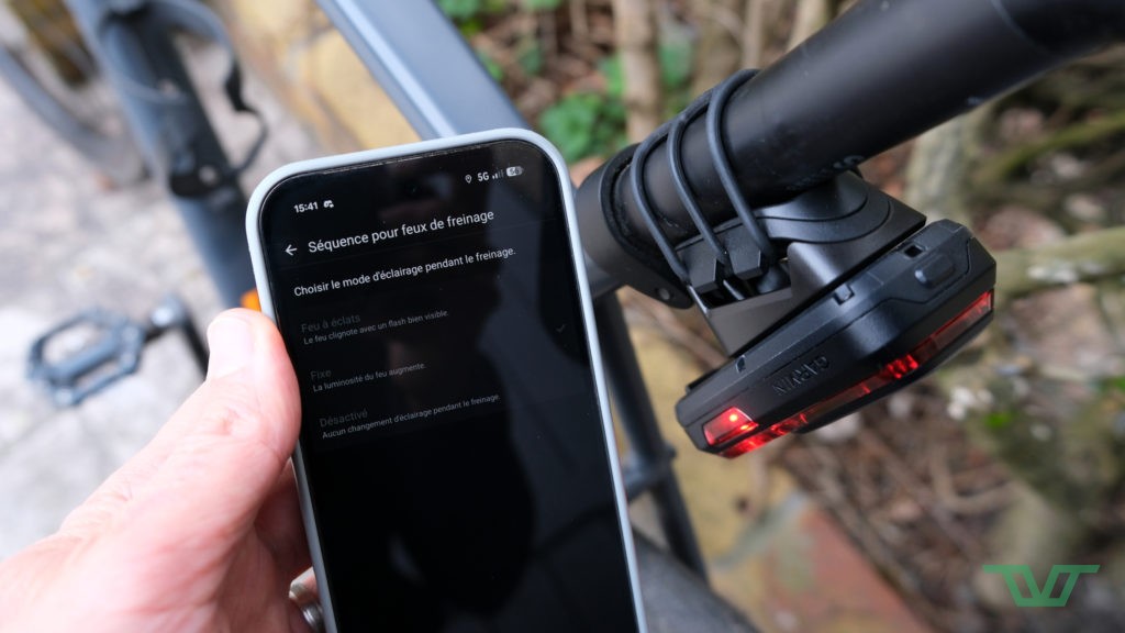Le premier point que nous pouvons aborder est l’apport de la fonction « feu stop » en plus du simple éclairage qui améliore sa visibilité sur la route. C’est un gros plus en terme de sécurité car cela permet d’alerter les autres véhicules d’un freinage en cours. On peut d’ailleurs choisir dans les options le comportement que l’on préfère lors des ralentissements : aucun changement au niveau de l’éclairage, augmentation de l’intensité fixe, augmentation de l’intensité lumineuse en mode clignotant.