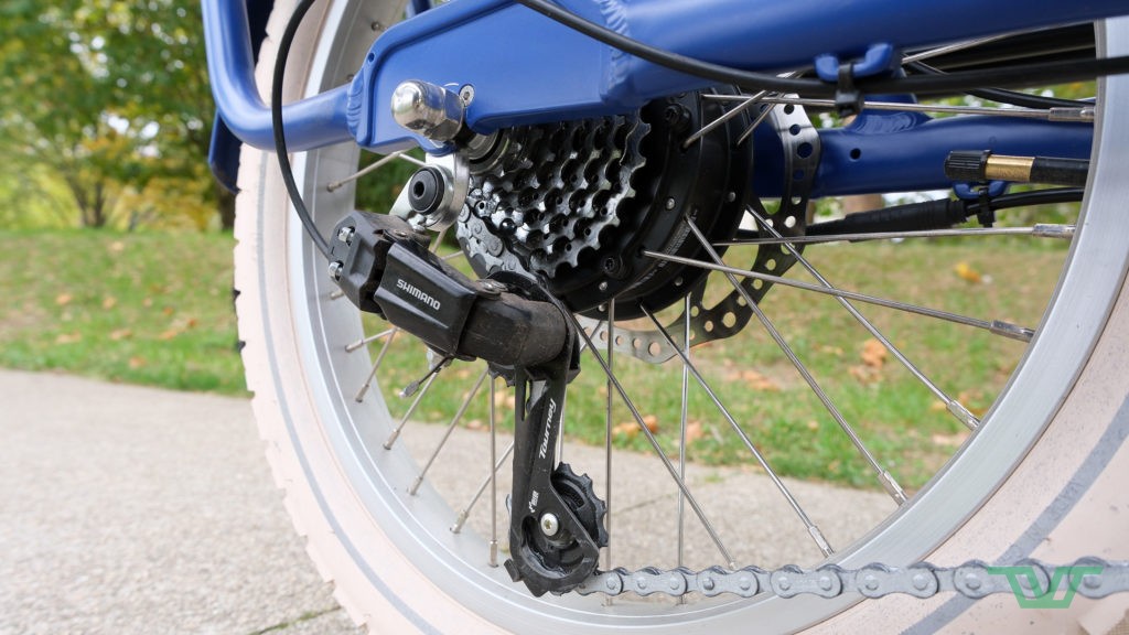 Côté cycle, Gaya reste sur une transmission à chaîne avec un dérailleur Shimano Tourney 7 vitesses et des shifters à gâchettes. Une transmission d’entrée de gamme qui est bien réglée et fait le job malgré tout. Avec une cassette 11-28, on conserve une aisance de pédalage sur toute la plage d’assistance du vélo et même un peu au-delà des 25 km/h pour l’accompagner en descente, jusqu’à 30-35 km/h environ.