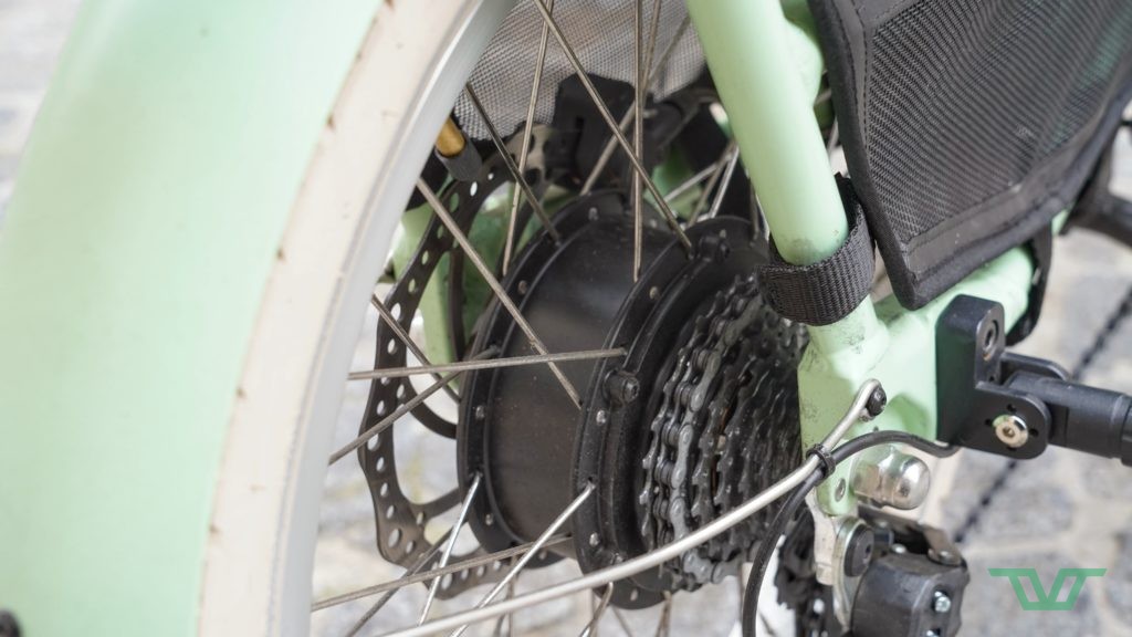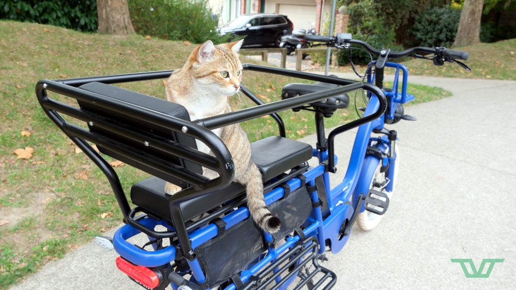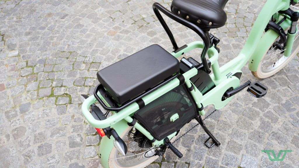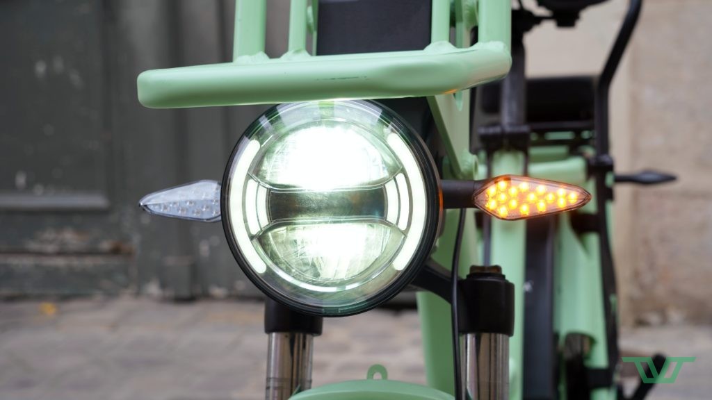 Il y a également le gros phare rond à l’avant, à la puissance d’éclairage agréable. Suivent les clignotants montés sur des bras souples pour éviter la casse. Un gage de sécurité supplémentaire sachant que tout le monde ne sera pas forcément à l’aise pour lâcher à une main avec ses enfants à l’arrière afin d’indiquer un changement de direction. Seul petit bémol, il faut plus d’une seconde entre le déclenchement du clignotant et son allumage, mieux vaudra donc anticiper au maximum.