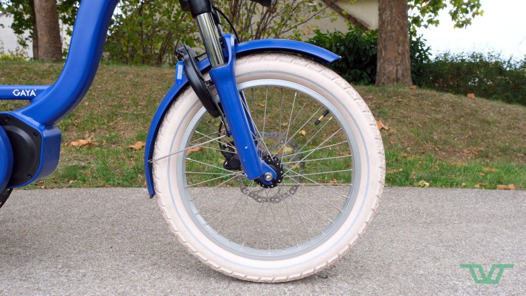 Quant au choix de pneus issus de la gamme trekking de Kenda et non de la gamme city, on le trouve pertinent : on ne note pas un volume sonore trop important au roulage sur l’asphalte, le grip est bon, et sans doute un peu meilleur sur chaussée humide tandis que l’on aborde sereinement les portions de routes un peu cabossées ou les chemins. Selon Gaya, ces pneus résistent mieux aux crevaisons que ceux du premier modèle.