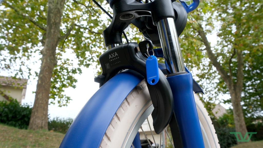On retrouve également un carter venant protéger la transmission et éviter les taches de cambouis sur le bas du pantalon. Quant à l’antivol de roue, il est bien intégré et particulièrement appréciable sur un vélo urbain, facilitant les arrêts minutes. Avec sa clé prisonnière et accompagné d’une chaîne plugin, cela offre une solution de sécurité idéale pour les courts arrêts, et l’on pourra y ajouter un antivol U plus costaud pour des stationnements plus longs et/ou risqués.