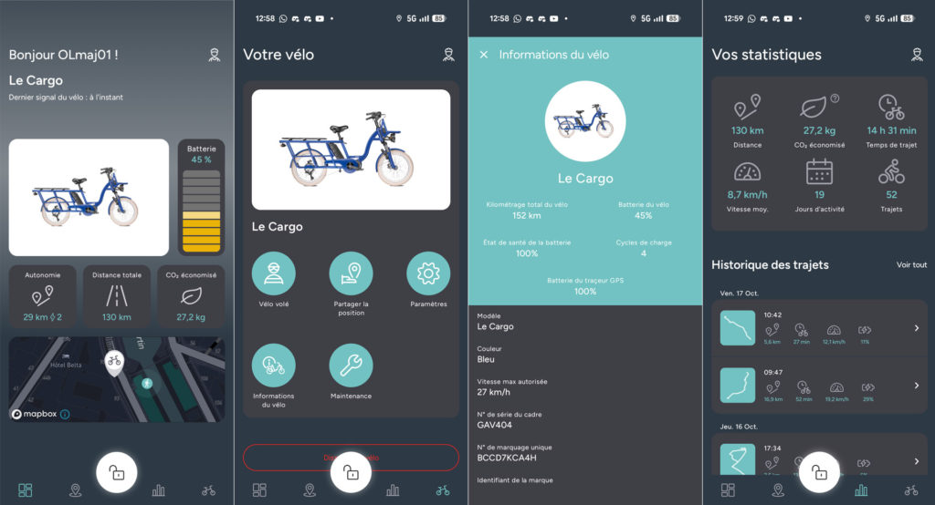 Le tout fonctionne de pair avec une application mobile qui n’est pas du tout nécessaire au quotidien si l’on ne veut pas s’encombrer d’une charge mentale numérique supplémentaire, mais qui apporte tout de même son lot de fonctionnalités et informations. Claire, bien organisée et agréable à utiliser, cette application permet par exemple de consulter la carte d’identité de son vélo ou encore de le verrouiller/déverrouiller (ce qui peut aussi se faire à l’aide du badge NFC).