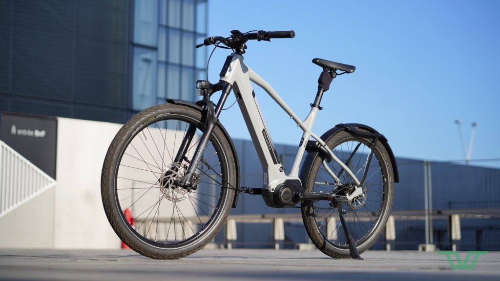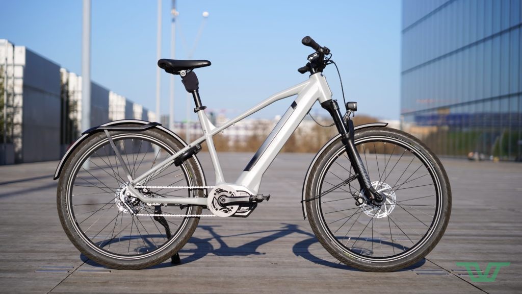 Pour le reste, le Crossover GT est plutôt bien équipé avec des freins à disque hydrauliques Tektro, de gros pneus Schwalbe Green Marathon, une tige de selle suspendue Suntour, une fourche Rockshox, un feu Hermans et bien évidemment tout l’équipement indispensable pour une utilisation au quotidien : garde-boue, porte-bagages, béquille et même un antivol de cadre de série.