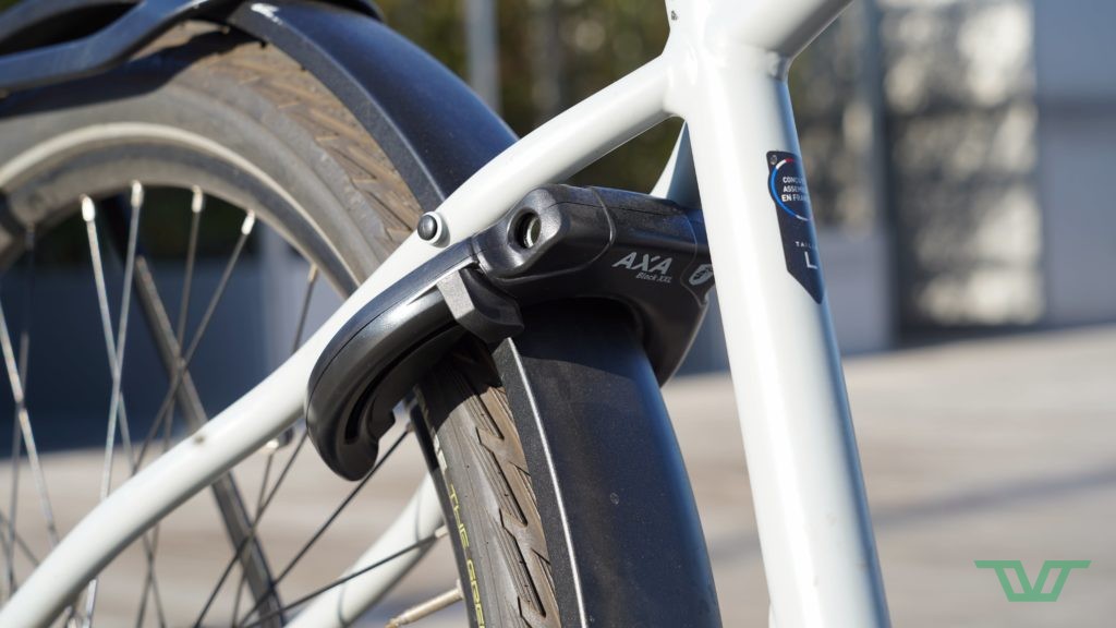 Un antivol de cadre AXA Black XXL est également monté de série sur le vélo. Cet accessoire est pour nous indispensable pour les arrêts minute. C’est tout simplement l’antivol le plus rapide à mettre. Il évite qu’un voleur opportuniste ne parte avec le vélo. Cet antivol utilise une clé différente de celle utilisée pour sécuriser la batterie. C’est dommage, la clé unique est très pratique au quotidien.