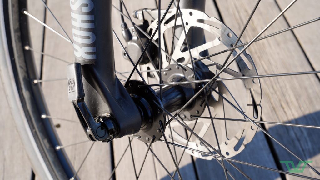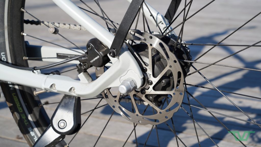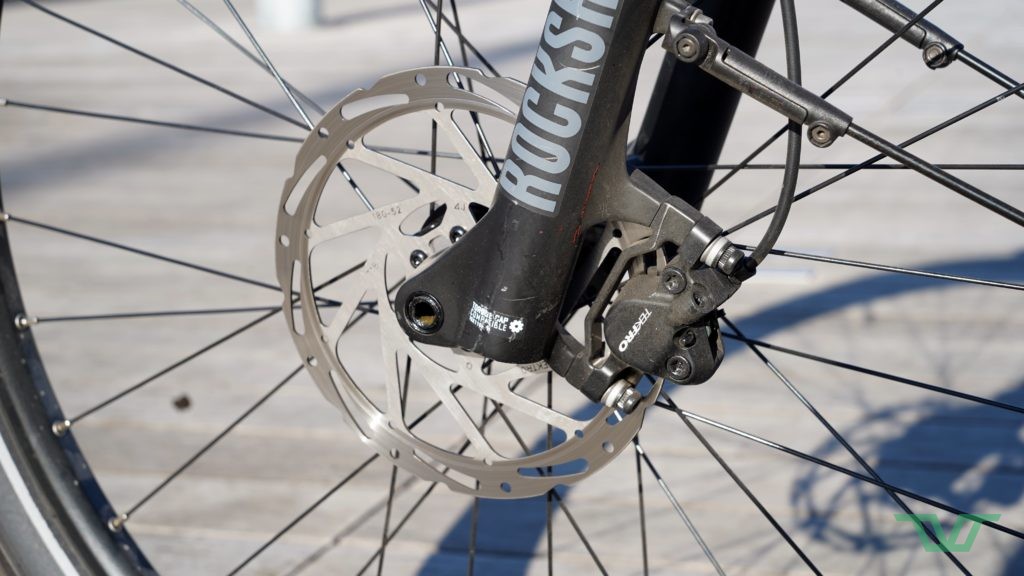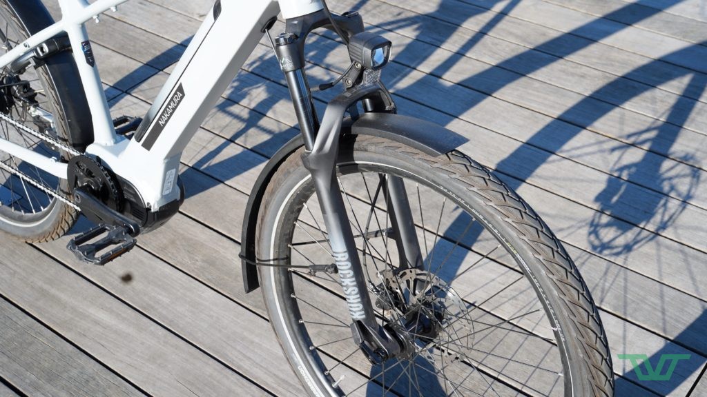 Côté freinage, le Nakamura CrossOver GT embarque des freins à disque hydrauliques Tektro HD-T3020 utilisant un étrier à 2 pistons mordant des disques de 180 mm à l’avant et 160 mm à l’arrière. On ne sait pas si le rodage des plaquettes a été raté sur notre exemplaire de test, mais ces freins manquent un peu de mordant. On ne retrouve pas l’efficacité des célèbres Shinano MT200 par exemple. C’est dommage, d’autant plus que ces freins sont bien aidés par les larges pneus Schwalbe The Green Marathon de 27,5 pouces avec leur gomme Addix Eco.