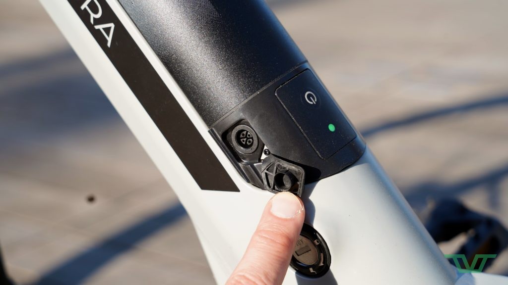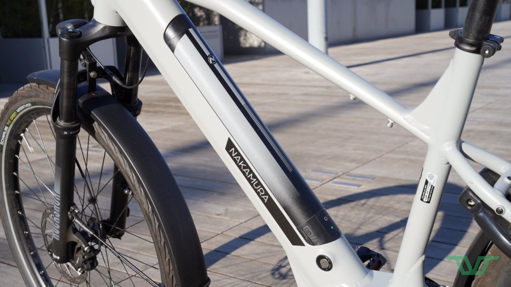 Le Nakamura Crossover GT embarque une batterie amovible affichant une capacité exacte de 460,8 Wh (12,8 Ah 36 V). La batterie est sécurisée par un verrou à clé qui, comme dit précédemment, n’utilise pas la même clé que l’antivol de cadre.