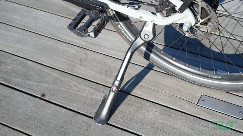 La béquille est assez classique. Placée sur les bases arrières, elle ne gêne pas lorsque l’on recule le vélo : les manivelles peuvent tourner librement. La hauteur de la béquille est réglable à l’aide d’une clé six pans.