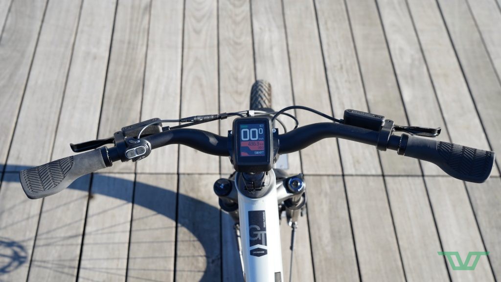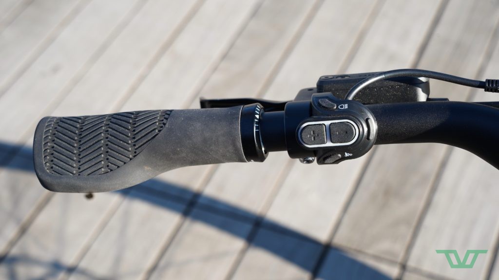L’utilisation d’un moyeu à 3 vitesses automatique simplifie le poste de pilotage. A droite, on retrouve uniquement le frein et la sonnette (qui n’est pas présente sur la photo). A gauche, la commande de l’assistance et de l’écran.
