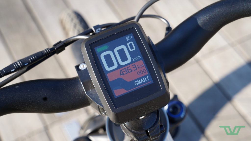 Les informations affichées à l’écran sont limitées. On retrouve le logo de la batterie plus ou moins rempli en fonction du niveau de batterie, la vitesse, le mode d’assistance choisi et une autre information qu’il est possible de changer grâce au bouton d’alimentation : la distance totale (ODO), la distance du parcours, la puissance du moteur, la puissance du cycliste (humaine), la consommation moyenne (Ah/km), la consommation instantanée et l’estimation de l’autonomie restante. Une seule de ces informations ne peut être affichée à l’écran. De plus, l’affichage du pourcentage exact du niveau de batterie n’est toujours pas disponible sur l’écran alors qu’elle l’est sur l’application.