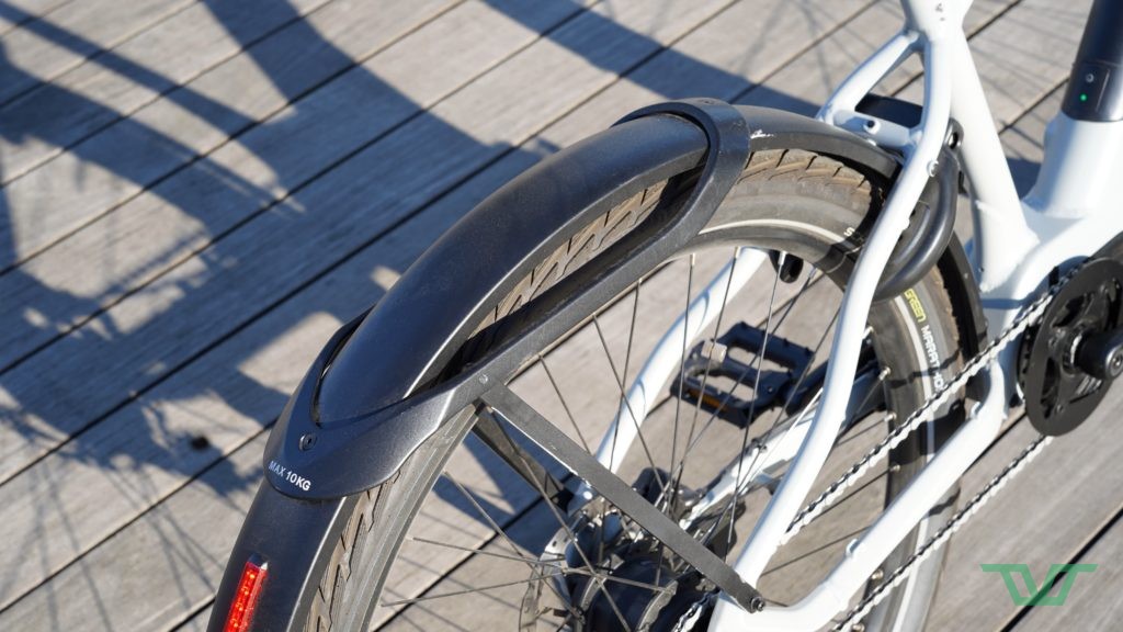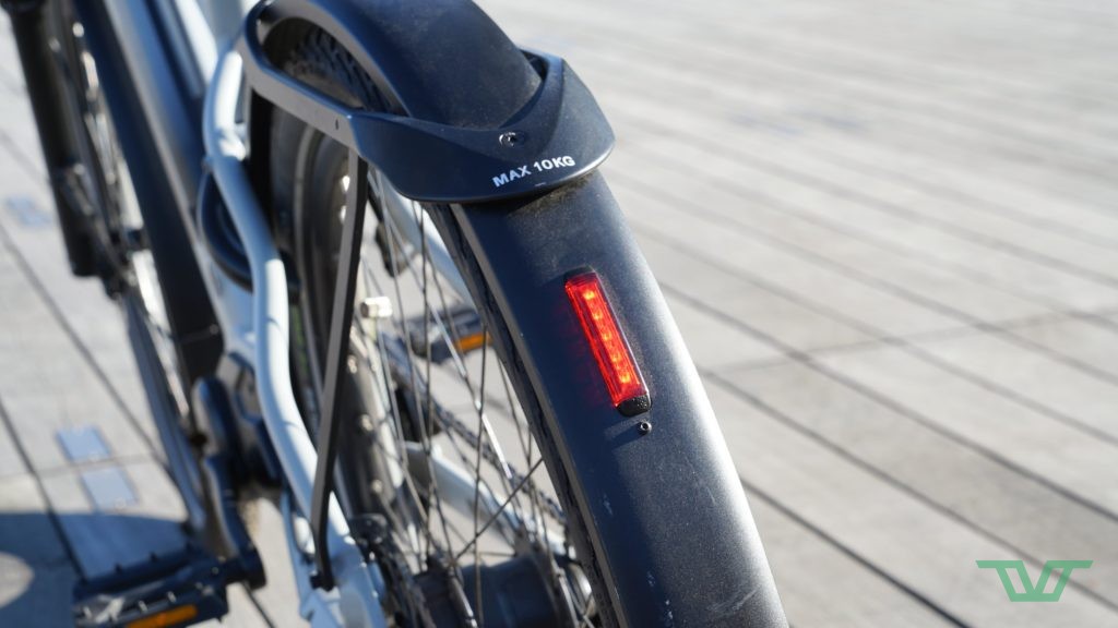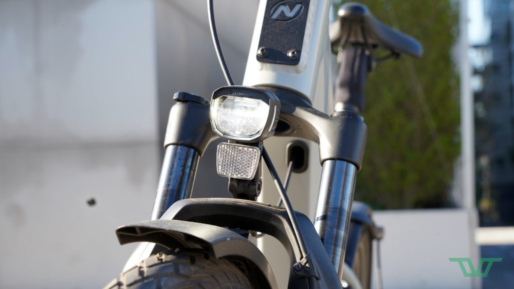Au niveau de l’éclairage, le vélo embarque un feu avant Herman Nordic MR5 d’une puissance de 140 lumens et d’un feu arrière Trelock LS 411 monté directement sur le garde-boue arrière. Le feu avant dispose d’une puissance suffisante pour rouler en ville, mais s’avère limité dans le noir complet surtout à 25 km/h. Le feu arrière dispose d’une fonction feu stop très pratique. L’intensité de l’éclairage augmente ainsi lorsque l’on ralentit ou que l’on freine afin de prévenir les autres usagers de la roue du ralentissement.