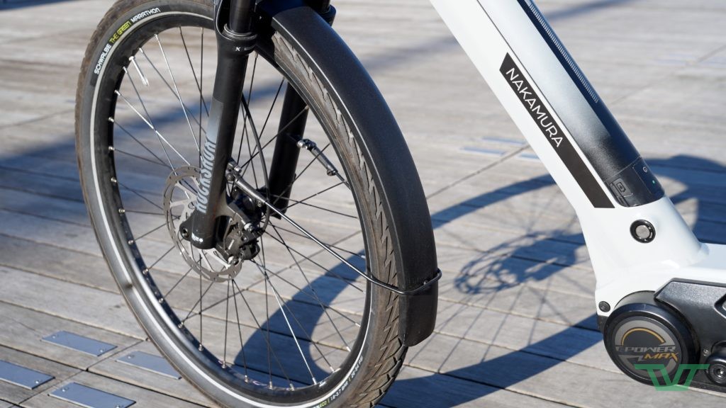 Une grosse partie du confort est assurée par les pneus Schwalbe The Green Marathon, la version la plus « écologique » des pneus increvables du fabricant allemand. Avec une largeur de 60 mm, ils offrent un beau volume d’air pour amortir les petits chocs. Surtout, ils offrent une très bonne résistance aux crevaisons avec un indice de 105. En comparaison, le Marathon Plus obtient 117 et le Marathon E-Plus, le pneu le plus résistant du marché, atteint 163. Le fabricant Nakamura a fait un excellent choix pour des pneus de première monte.