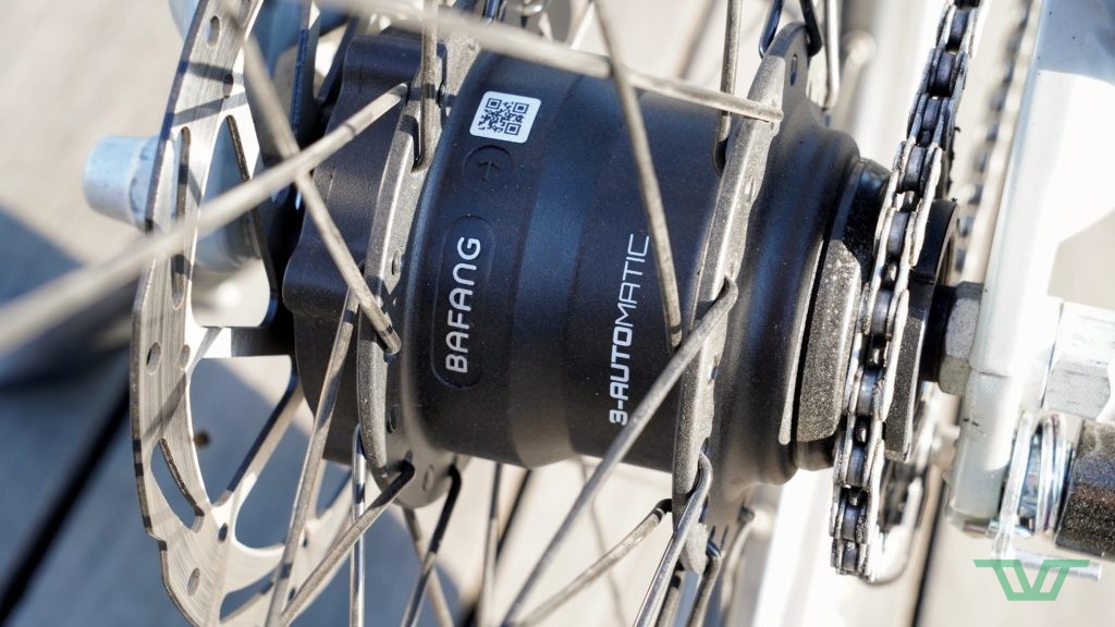 Le moyeu Bafang RG A310 offre 3 vitesses automatiques. Il n’y a rien à faire, le braquet change automatiquement lorsque l’on atteint 16 et 21 km/h. Cela permet de démarrer sans trop avoir à forcer sur les pédales et, à l’inverse, de pédaler avec une cadence d’environ 60 tours par minute à 25 km/h. A l’accélération, le passage des rapports se fait de manière fluide, sans à coup et donne même une sensation de puissance grâce au couple moteur.