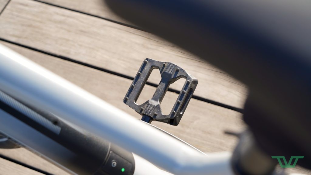 Les pédales plates en plastique sont confortables avec des baskets à semelle souple tout en offrant un bon grip grâce aux picots. En revanche, elles s’avèrent glissantes avec des chaussures de ville avec une semelle en bois par exemple. Heureusement, changer de pédales reste simple (cf. notre guide sur le choix et l’installation de pédales).