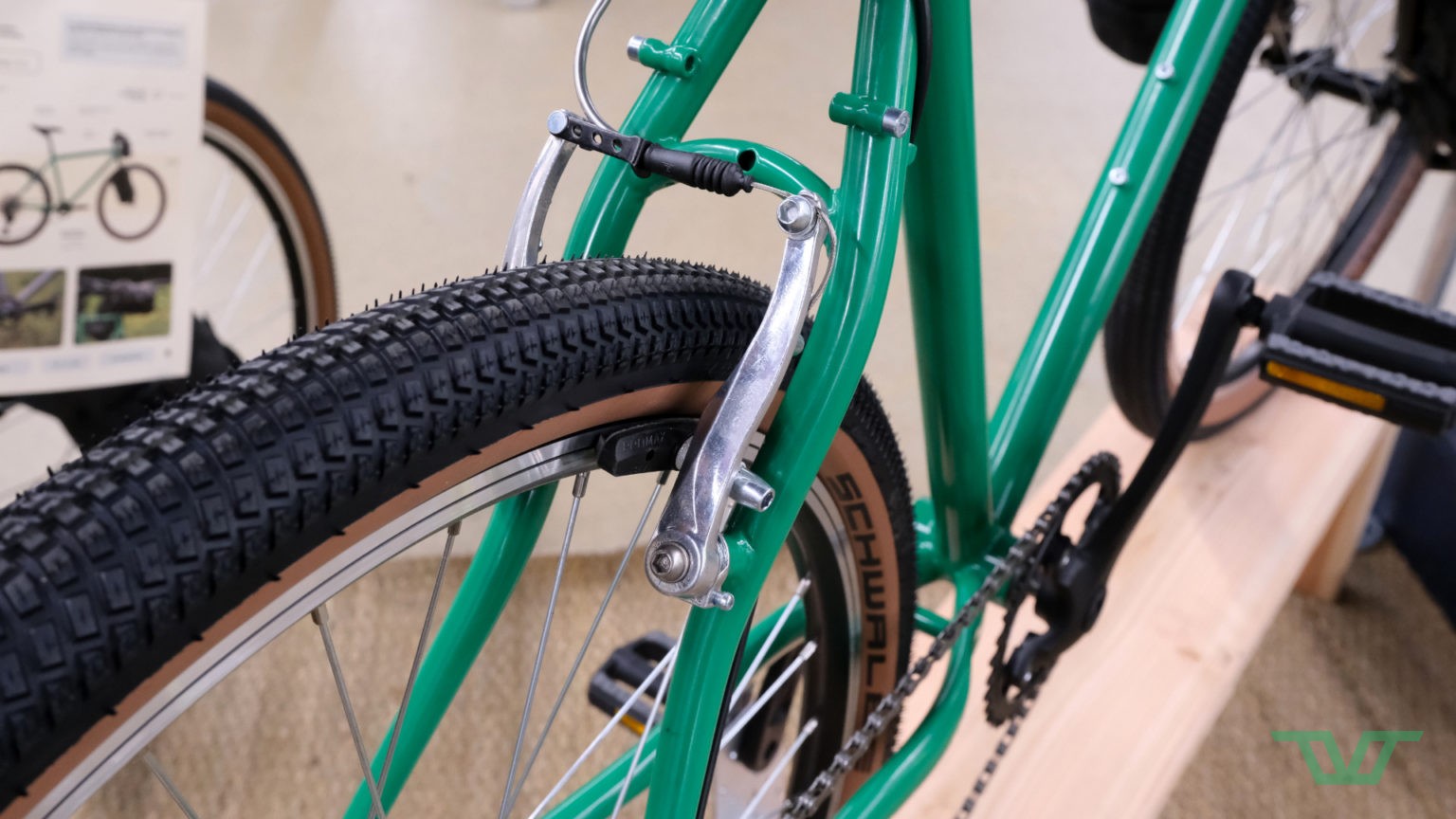 Forcément, c’est comme une madeleine de Proust et on est sous le charme de ce VTT 26″ vintage complètement repensé. Il est désormais monté d’une transmission Shimano Deore mono plateau 11 vitesses et de pneus Billy Bonkers typés BMX. Le freinage est forcément confié à des V-Brake à patins là aussi.