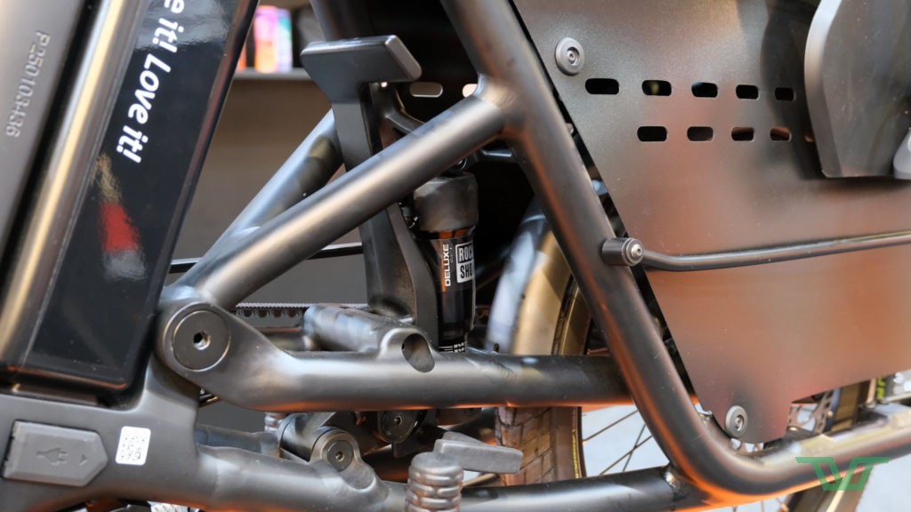 C’est quelque chose qui est extrêmement rare, pour ne pas dire unique, sur le segment des vélos longtails. En effet, ces vélos sont conçus pour porter beaucoup de poids à l’arrière (passagers, matériel, courses, etc.) et faire reposer ce poids sur un amortisseur n’est pas quelque chose d’évident. Sur un vélo cargo, on va généralement chercher à maximiser la capacité de charge en premier lieu, plutôt que le confort des passagers.