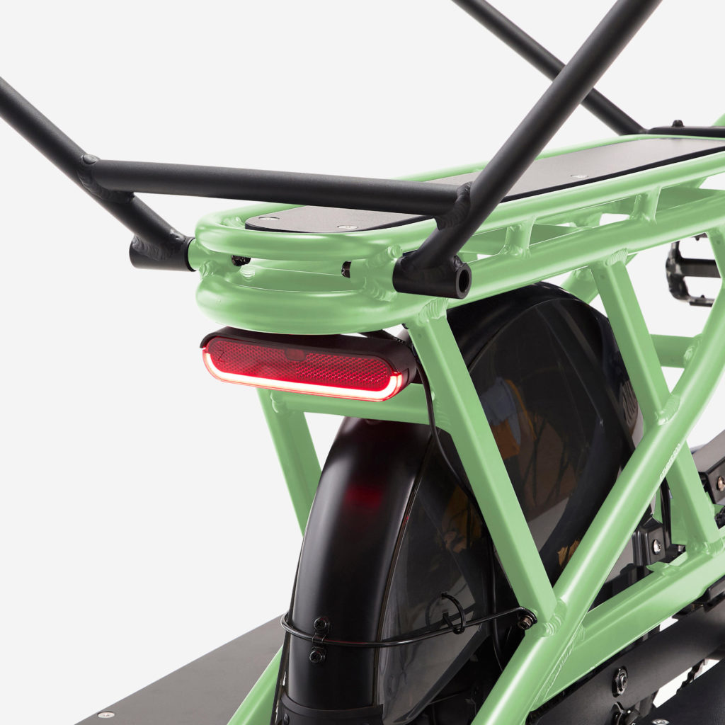 En contrepartie, le vélo prend un peu d’embonpoint et gagne 1 kg à vide. Il s’agit d’un longtail « full size », long de 220 cm pour 68 cm de large. En taille unique, il s’adapte aux cyclistes mesurant entre 155 et 195 cm.