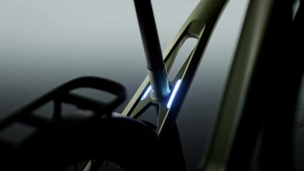 Un cadre qui intègre également le Aesthetic Lighting System de Tenways. Un nom qui définit les efforts d’intégration de l’éclairage, avec notamment la présence de petites leds de part et d’autre du tube diagonal à la jonction avec la tige de selle. Un effet design qui doit aussi diffuser une lueur au niveau des jambes en mouvement pour améliorer la visibilité du cycliste de nuit.