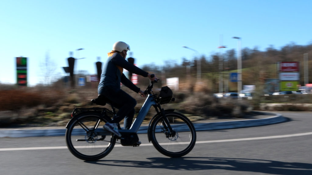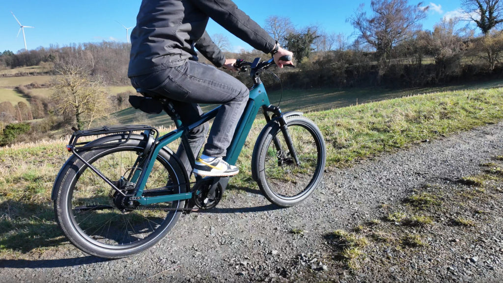 Si l’on se sent à notre aise sur route, dans un confort de déplacement complet, il suffit de quitter le bitume pour les chemins, y compris jonchés de feuille, mouillés, avec pas mal de dénivelé, pour se rendre compte que ce Charger5 a le tempérament nécessaire pour s’aventurer au-delà de l’asphalte. Et encore, notre vélo d’essai est équipé de pneus Super Moto X de chez Schwalbe, moins polyvalents que les Johnny Watts dont il peut aussi être monté. Avec ces derniers, ce VTC électrique à tout faire promet d’être très capable en tout terrain également.