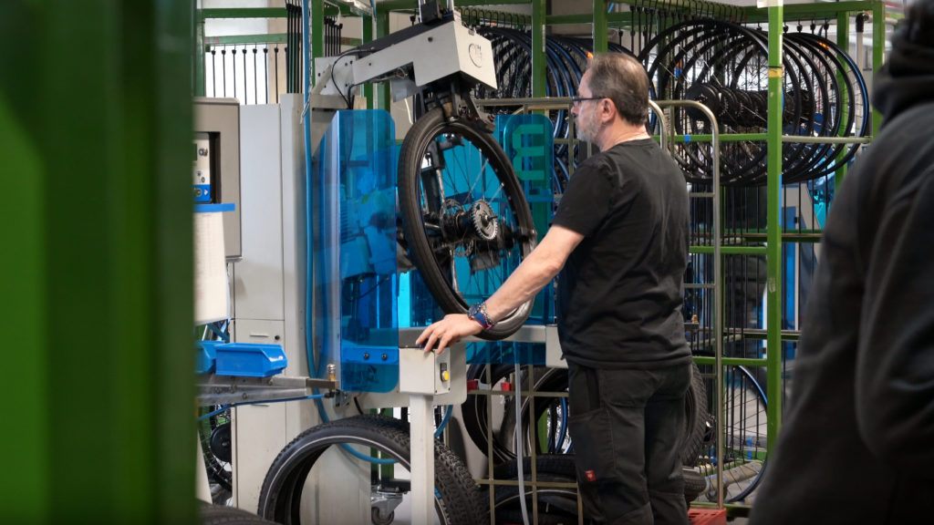 Première étape, le rayonnage. Dans un espace lumineux, les jantes s’alignent, les opérateurs tendent les rayons avec l’aide de machines de précision, la tension est mesurée, ajustée, vérifiée. Certaines roues sont reprises manuellement lorsque nécessaire. Quelques mètres plus loin, les pneus sont montés, gonflés, inspectés. Et chaque roue rejoint la chaîne d’assemblage prête à donner vie à un vélo.