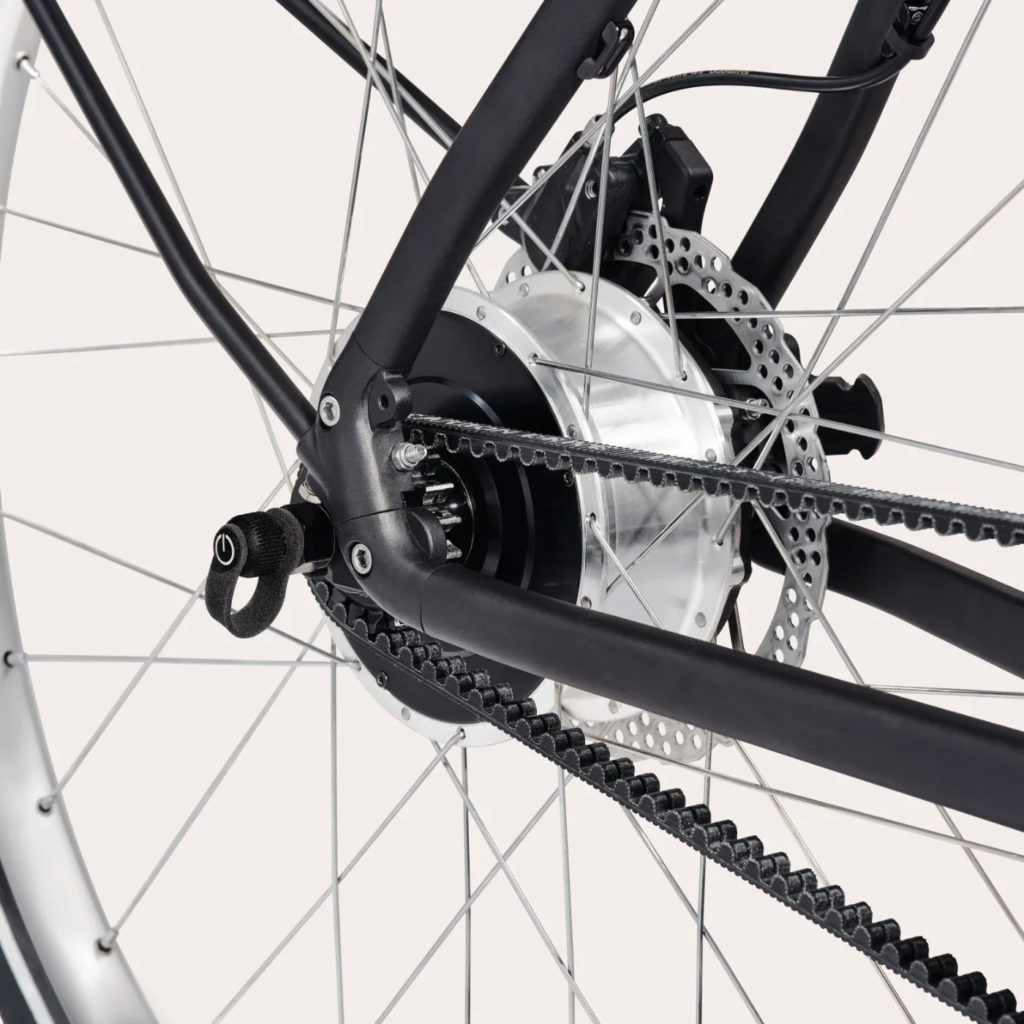 D’autant qu’il faudra ici composer avec une transmission monovitesse. Eh oui, Bastille reste fidèle à la courroie, ce qui a du sens sur un vélo pliant citadin (moins d’entretien, pas de cambouis). Mais en intégrant un moteur moyeu arrière, on perd techniquement la possibilité d’exploiter des vitesses. Certes, cela finit d’installer le Bastille E comme un vélo extrêmement simple à utiliser, mais cela le prive d’une certaine polyvalence. A voir, donc, comment il se comporte sur le terrain.