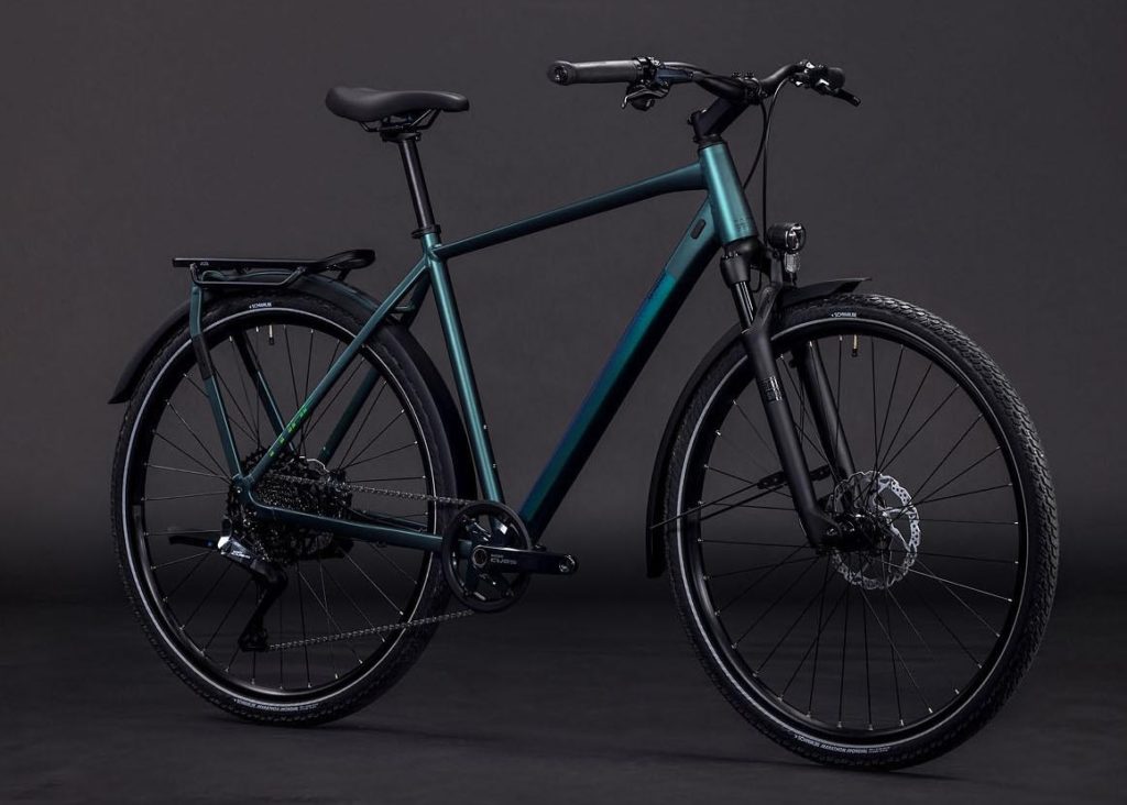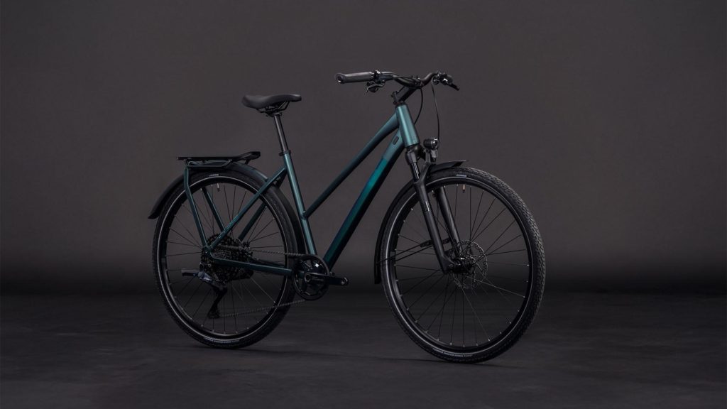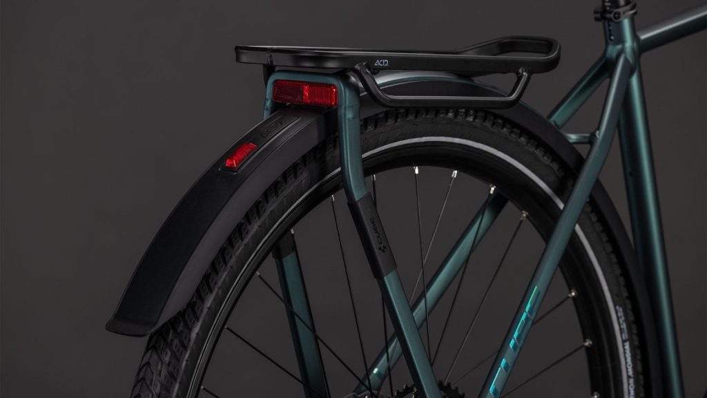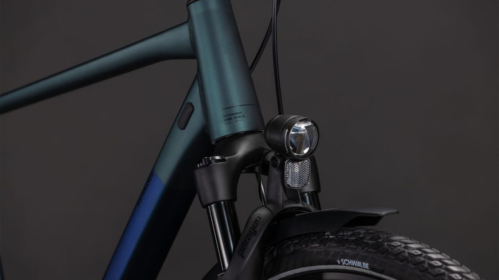 Décliné avec un cadre classique en diamant et un cadre semi-ouvert facilitant l’enjambement, le Cube Kathmandu SLT est tout équipé pour le quotidien. On retrouve ainsi des garde-boue, un porte-bagages supportant 25 kg, une béquille et un éclairage alimenté par le moyeu Q’Auto.