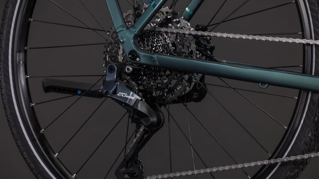 Cube a choisi une cassette 11 vitesses pour son dérailleur Shimano Cues Di2, mais ce dérailleur fonctionne également avec une cassette 10 vitesses. Notez que l’on conserve tout de même une manette de dérailleur au guidon pour le changement manuel (et électronique) des vitesses.