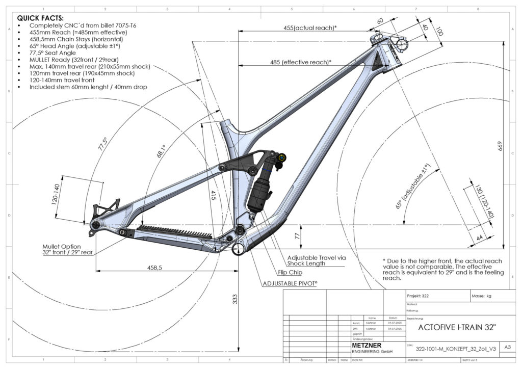 Fidèle à l’ADN d’Actofive, la plateforme demeure hautement modulable : débattement arrière ajustable, jeu de direction à trois positions, double flip-chip pour jouer sur l’anti-squat ou le comportement de suspension, et possibilité de monter en mullet 32/29ʺ pour ceux qui cherchent un compromis entre stabilité et agilité.