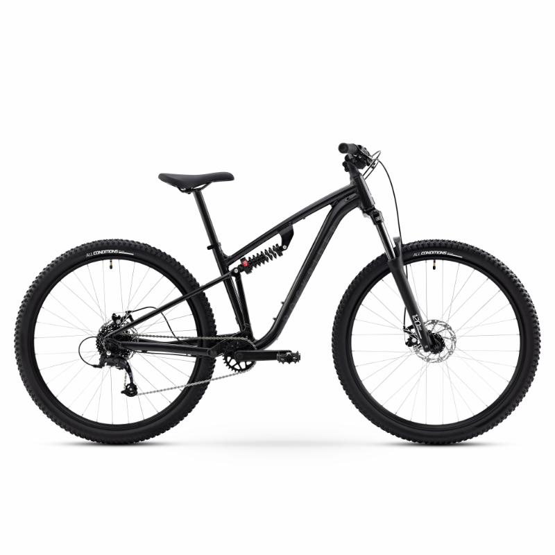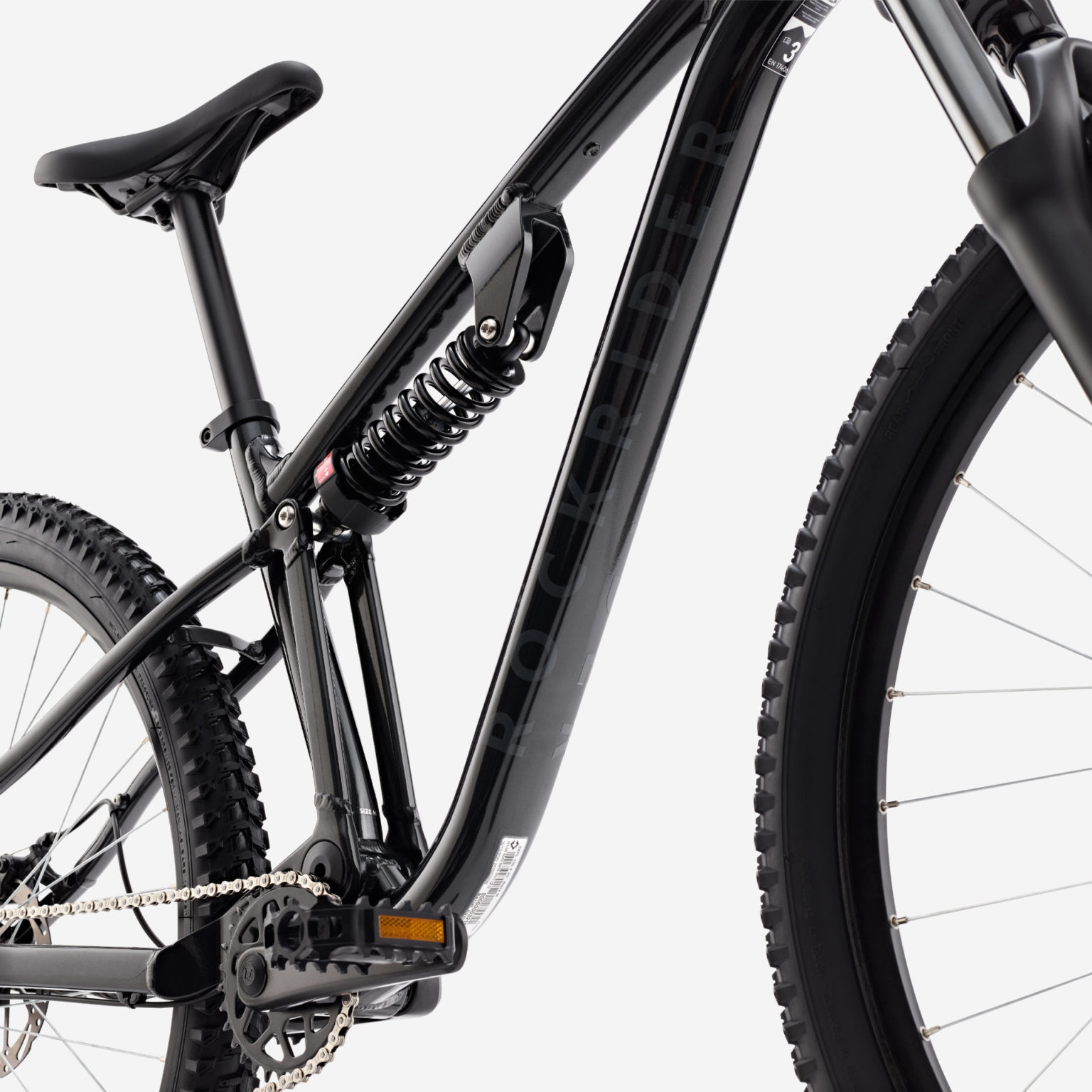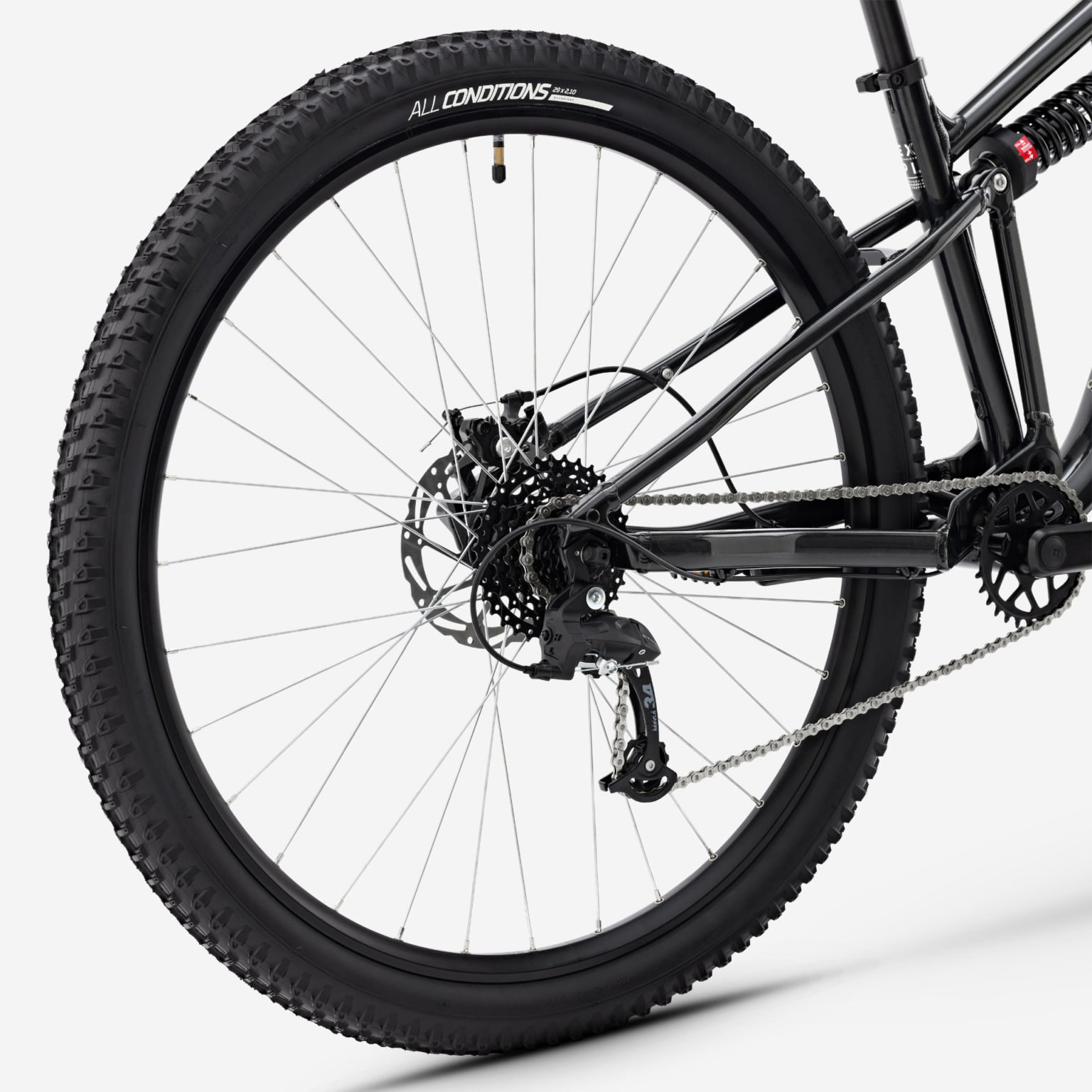 Donné pour 16,7 kg en taille M, ce vélo à cadre aluminium intègre des suspensions offrant 120 mm de débattement à l’avant comme à l’arrière, avec une fourche SR Suntour à plongeurs de 32 mm et un amortisseur UFIT. Il est monté de jantes Rockrider à corps de roue libre Shimano HG équipées de fonds étanches pour un montage tubeless. Elles sont chaussées en première monte de pneus Rockrider All Conditions en 2,1″ de section, qui – eux – ne sont pas compatibles tubeless.